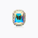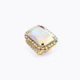 Alexa Cocktail Ring är en justerbar statementring med en stor, slipad rektangulär kristall som är inspirerad av norrskenets skiftande färger. Två rader av gnistrande kristaller ramar in stenen och skapar ett smycke som passar lika bra till fest och gala som till vardagens lyxiga accessoarer. Ett handgjort svenskt smycke för dig som vill bära något exklusivt, tidlöst och iögonfallande, även en perfekt present till mamma, syster eller flickvän.