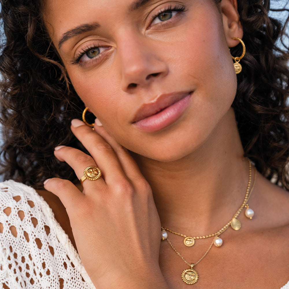 Inspirerad av solens värme och energi, Apollo-kollektionen ger en touch av mytologi och lekfull elegans till dina looks. Med eleganta solmotiv och skulpterade detaljer symboliserar varje smycke styrka. Apollo-kollektionen finns tillgänglig i ring, halsband och örhängen.