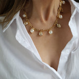 Låt oss introducera Ayra Necklace - ett statement halsband som kombinerar både elegans och attityd! Designen som präglas av både hängande kristaller och glänsande pärlor skapar en fantastisk statement-look som garanterat drar blickarna till sig. Oavsett om du klär upp dig för en speciell tillställning eller vill ge din vardagsoutfit något extra, är Ayra Necklace det perfekta tillbehöret för att höja din stil.