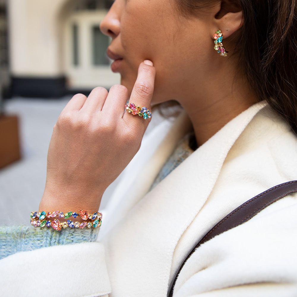 Our Gabriella Collection is definitely something else. This exclusive design features the highest quality crystals and will add the perfect amount of glam to your look. The collection includes bangles, earrings, and rings. Choose between Rainbow Combo, when you feel more playful and Crystal when you want to go for something more classic.