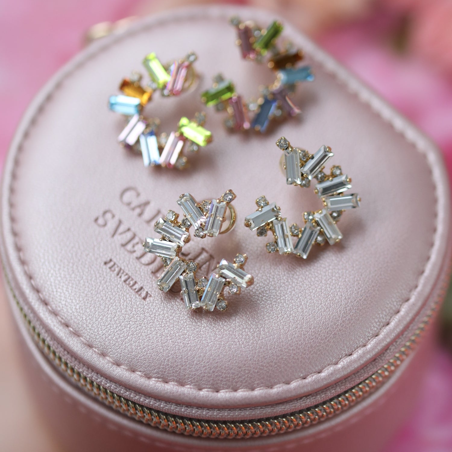 Kanske säsongens coolaste örhängen? Vår Gina Earrings är de perfekta örhängena för att lyfta din look till nästa nivå. Med baguette-kristaller som skapar en unik och trendig design passar dessa både till fest och vardags.