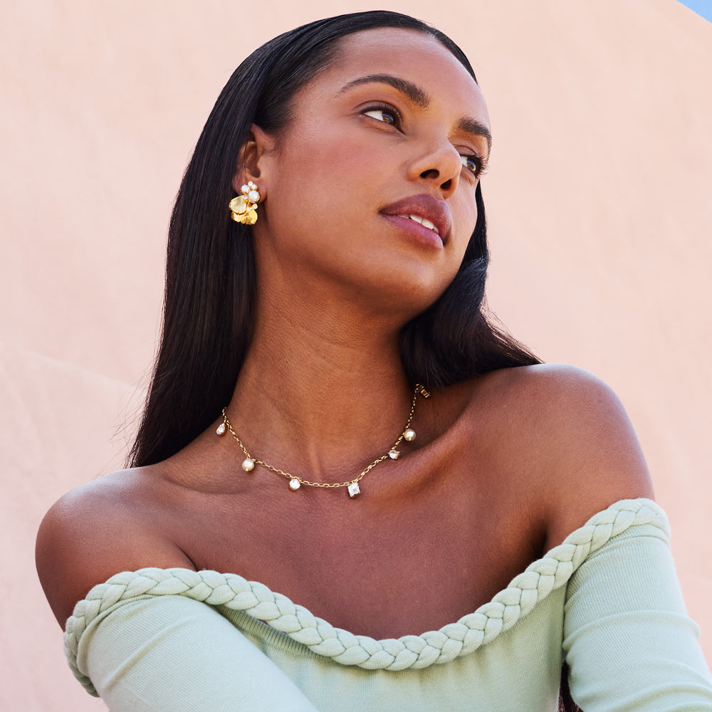 Lumina Necklace med kristaller och pärlor är smycket som kombinerar det klassiska med det samtida. Den eleganta designen fångar ljuset på ett subtilt men effektfullt sätt och ger din look en feminin touch. Ett halsband att bära varje dag - och älska i många år framöver.