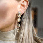 Dessa Lydia Long Örhängen har en vacker design av våra rektangulära kristaller hängandes ned i olika storlekar. De ger en glamorös och elegant stil till vilken klädsel du än väljer.