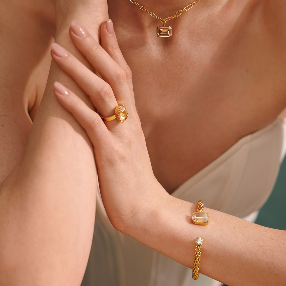 Lydia Ring kombinerar enkelhet med tidlös elegans. Med sin gnistrande rektangulära kristall fångar denna ring enkelt uppmärksamheten. Perfekt för den moderna kvinnan, då den adderar en touch av glamour till vardagslooken.