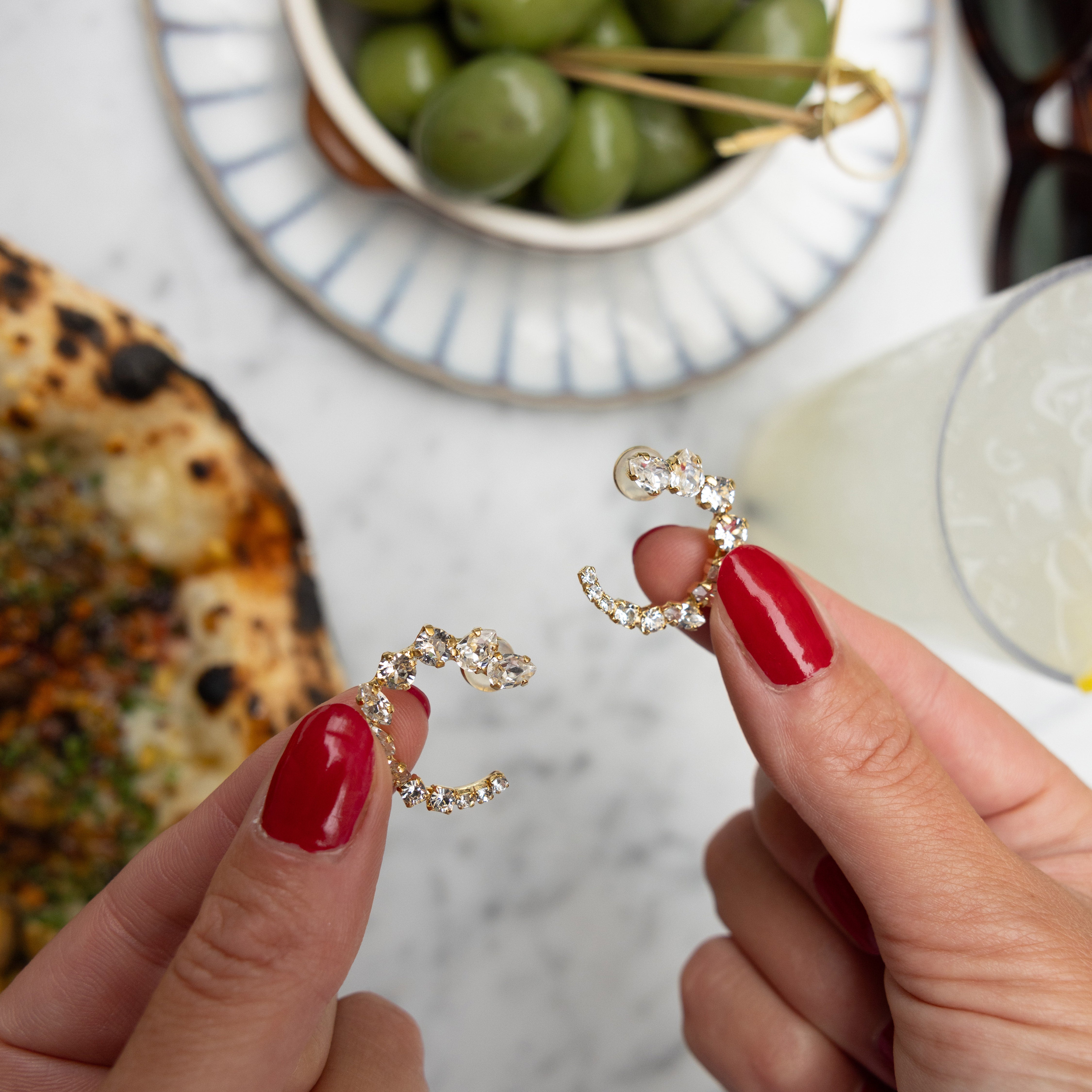 Säsongens måste i din smyckesgarderob: Mini Angie Earrings! Dessa är en mindre version av våra populära Angie Earrings med små kristall-navetter. Perfekt för dig som föredrar en mer subtil touch av glamour.