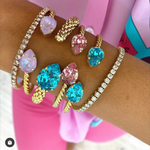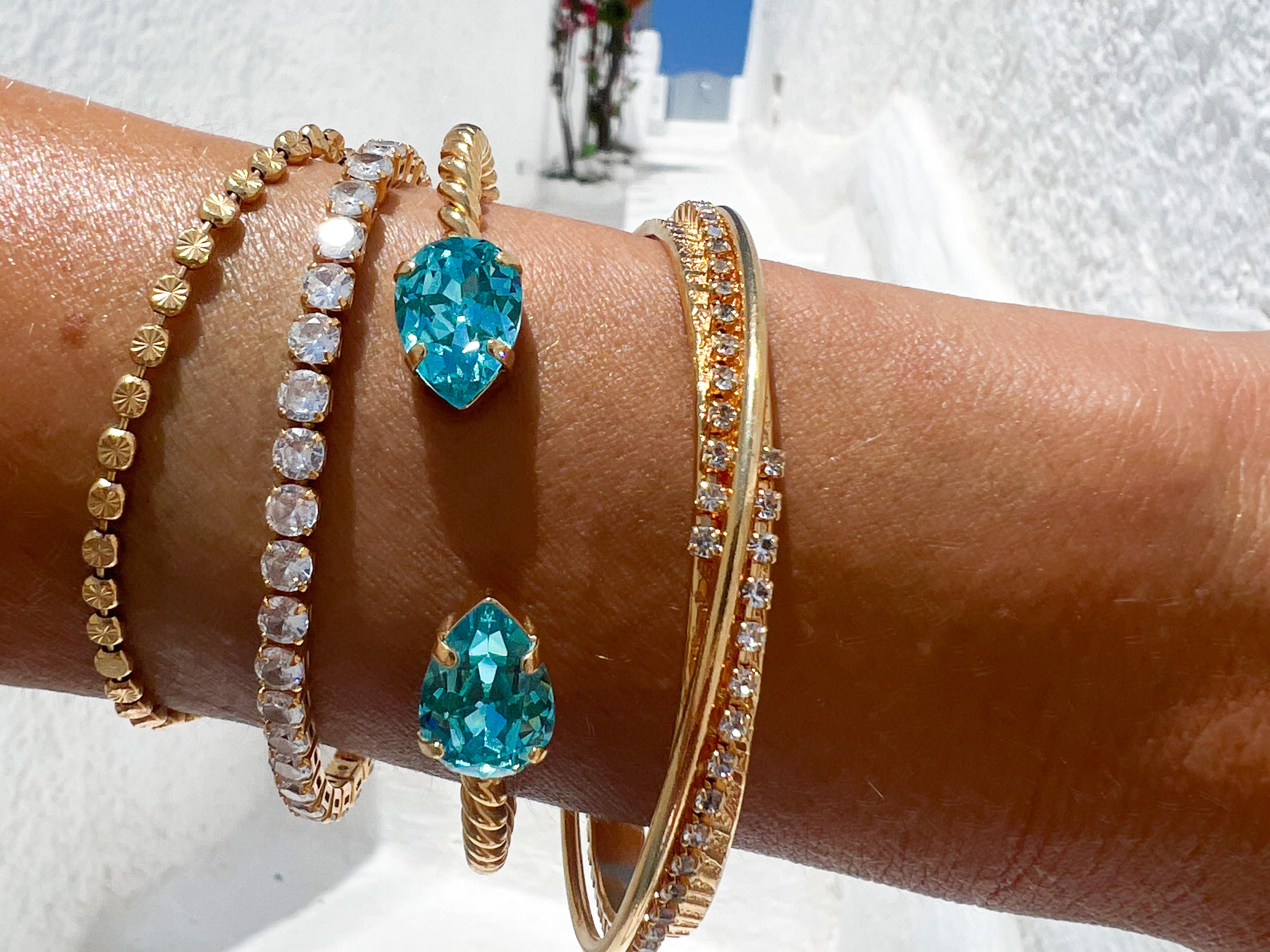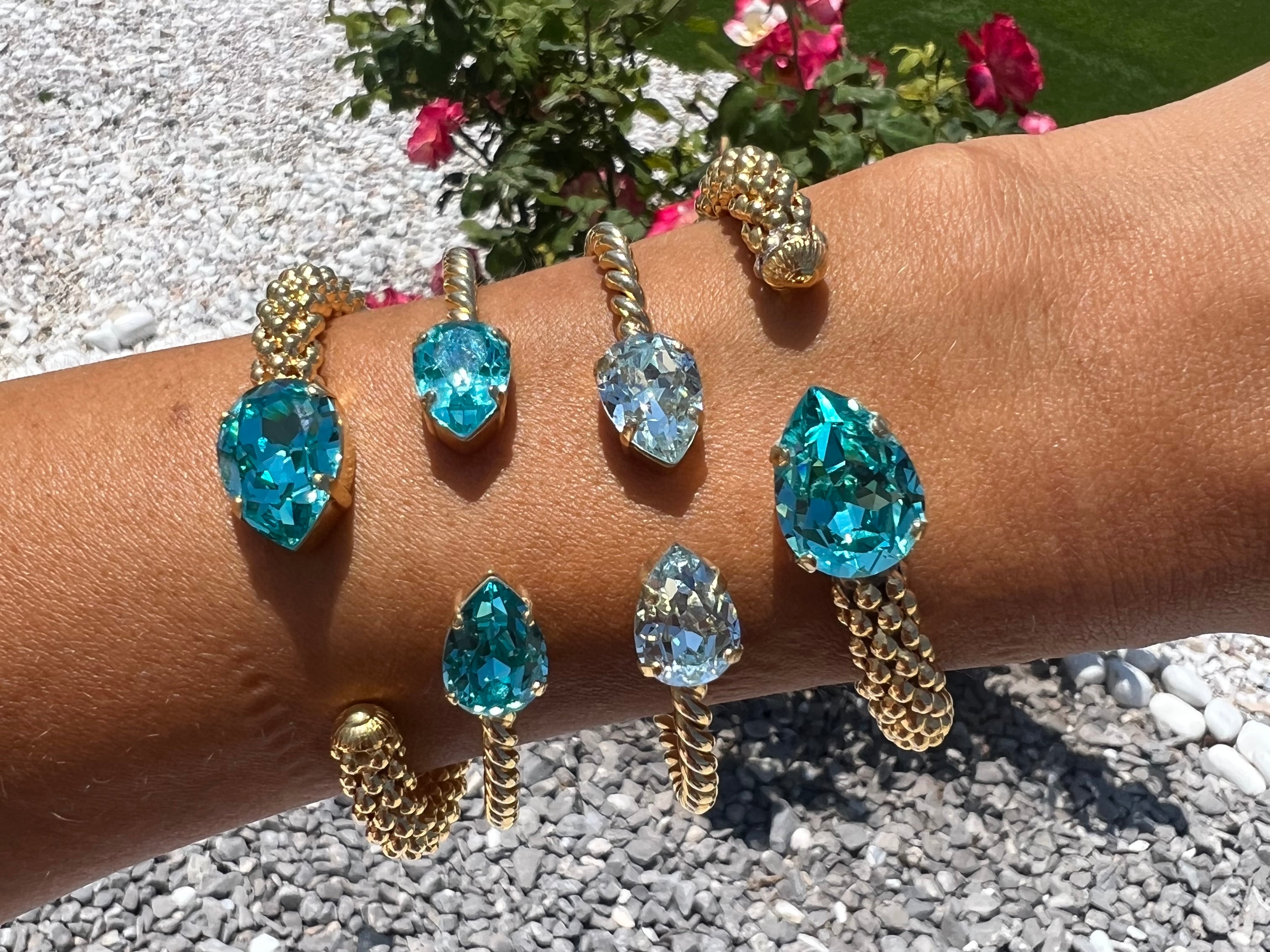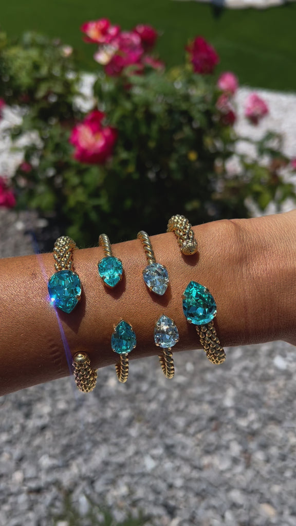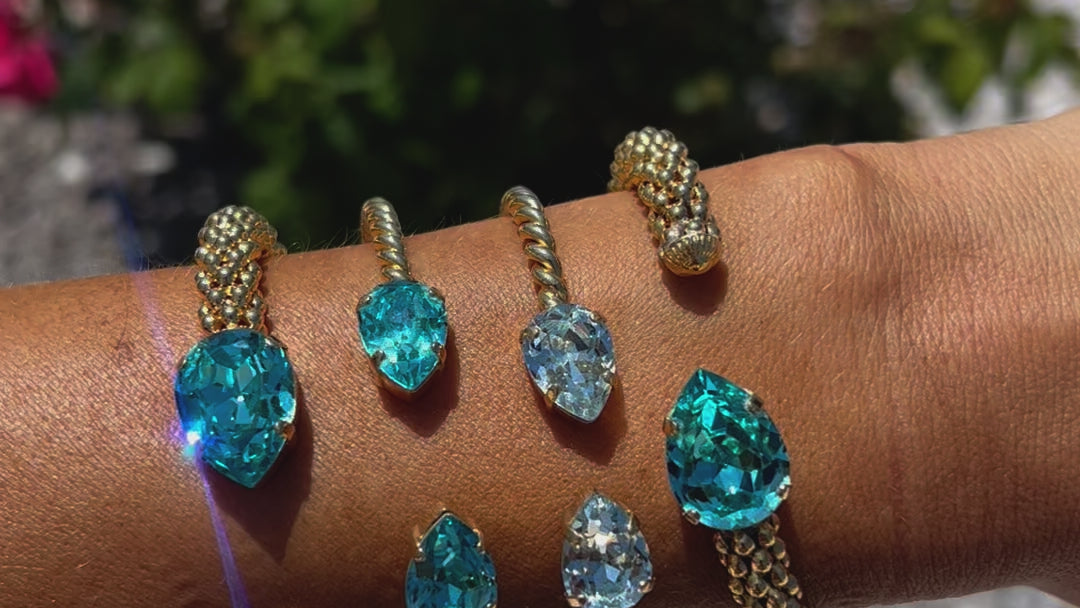 Vårt klassiska Mini Drop Bracelet är en stilfull detalj på din handled och gnistrar tack vare sina två droppformade kristaller av högsta kvalitet. Armbandet har en känsla av rep tack vare den vackert vridna metallen. Storleken kan justeras för att passa just din handled. Detta eleganta och gnistrande smycke passar alla tillfällen.