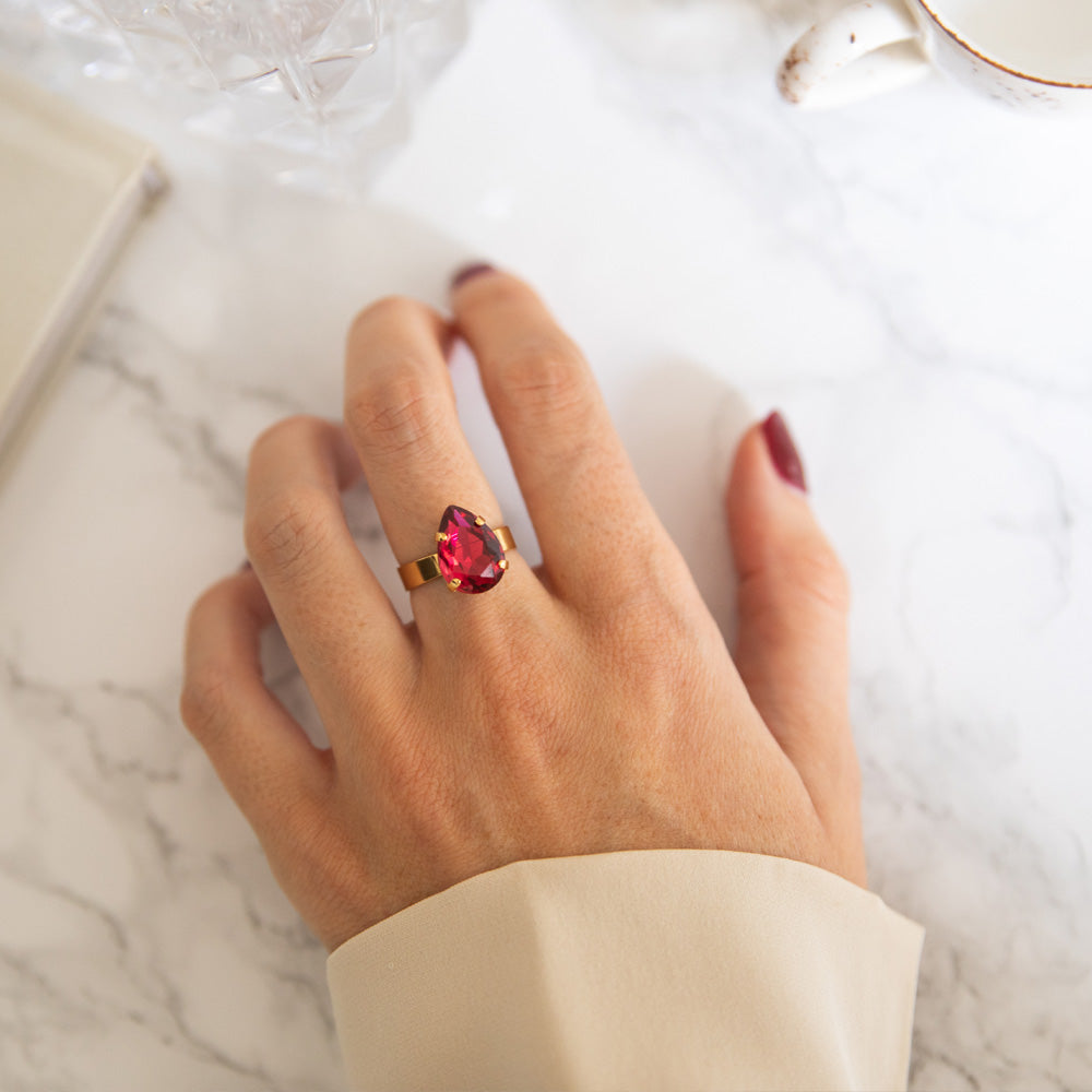 Mini Drop Ring pryds av en droppformad kristall av högsta kvalitet och passar alla tack vare den öppna baksidan som lätt kan justeras från ca 16 till 21 mm. Denna ring är en perfekt detalj för varje tillfälle och finns i flera olika stenfärger.