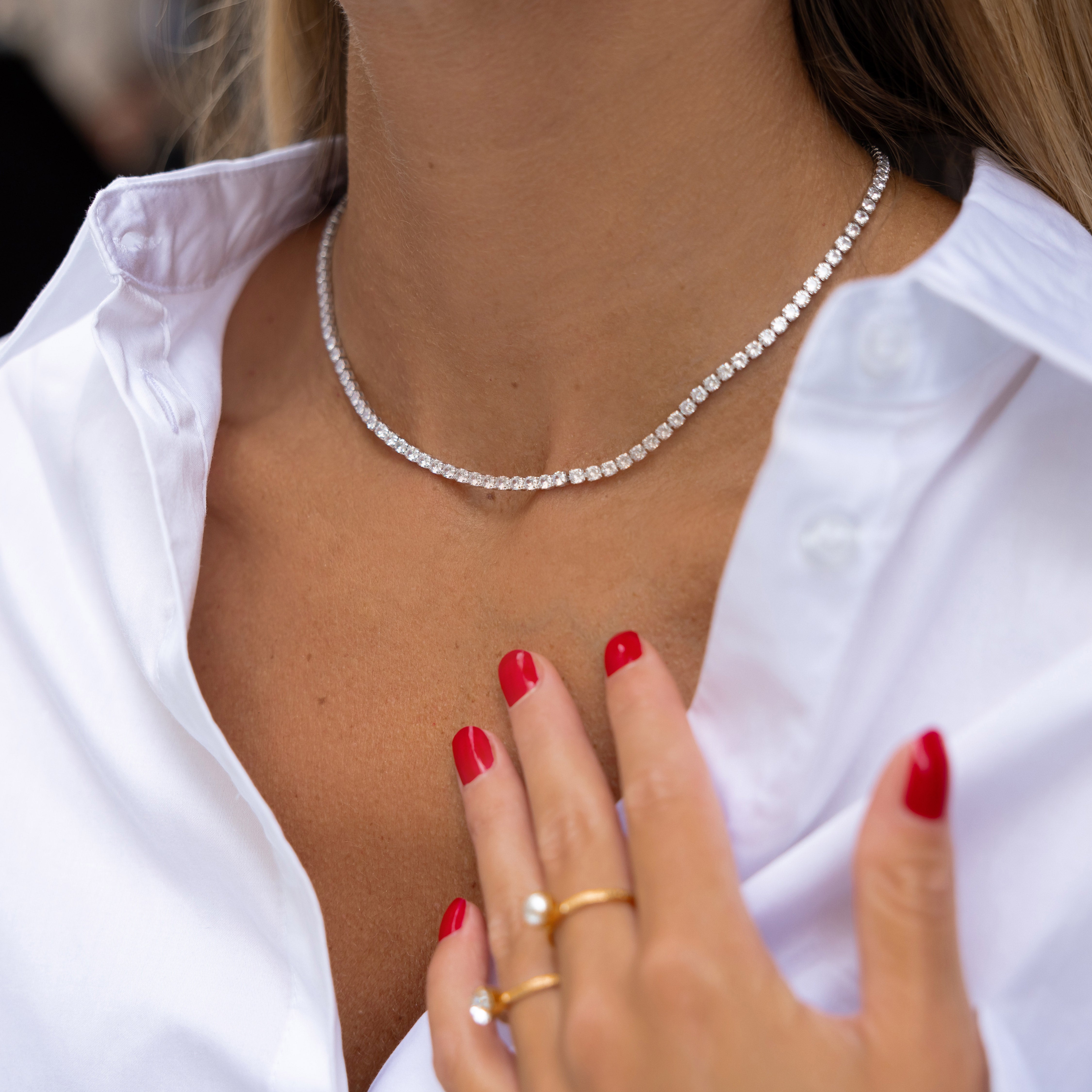 En mindre version av vårt populära Zara Necklace. Mini Zara Necklace är både tidlöst och lyxigt, vilket gör det till det perfekta smycket att styla med vilken look som helst. Halsbandet är gjort av cubic zirconia, som liknar en diamant med sin briljans och kristallklara lyster.
