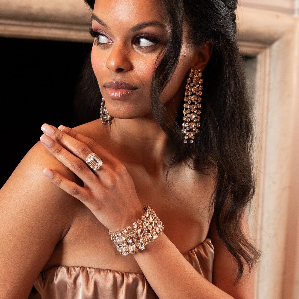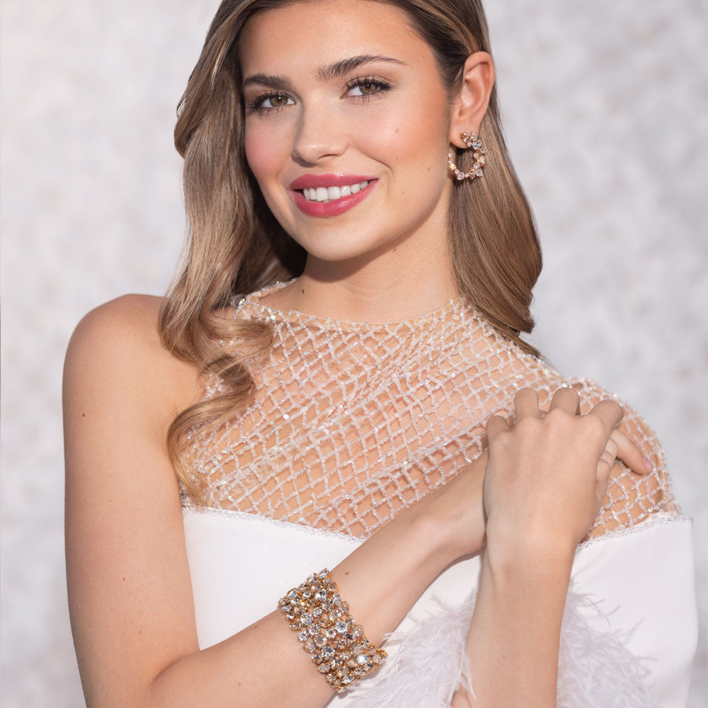 Multi Cuff Bracelet är ett armband med gnistrande kristaller i olika former och i gyllene samt klara toner, arrangerade i ett lyxigt och unikt mönster. Den breda, flexibla designen ger ett självsäkert statement och passar perfekt som festaccessoar till bröllop, gala eller bal. Ett smycke för dig som vill bära något exklusivt och tidlöst, lika slående till vardags som till nyår eller som en minnesvärd present till mamma, syster eller flickvän.