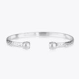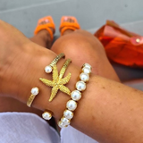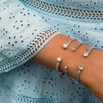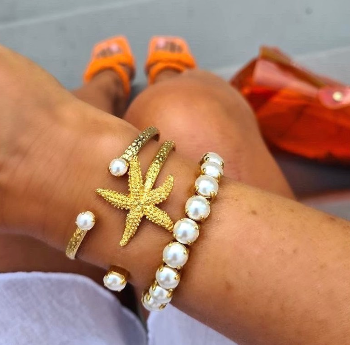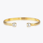 This sleek golden bracelet is beautifully set with round white pearls. The metal has a hammered textured. Adjustable size.