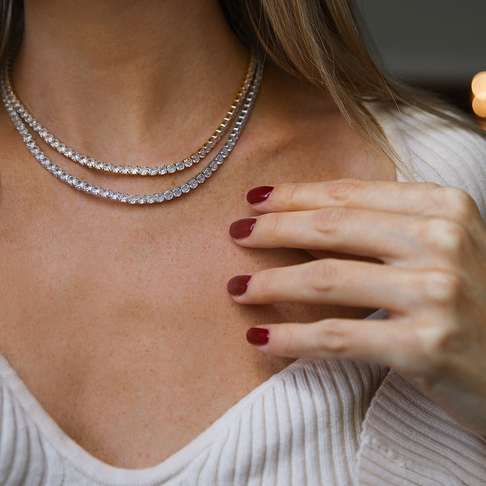 Detta halsband är ett absolut måste i din smyckessamling. Zara-halsbandet kombinerar tidlös elegans med en touch av lyx, vilket gör det till den perfekta smyckesdetaljen för alla tillfällen. Halsbandet är tillverkat av Cubic Zirkonia, som med sin glans och kristallklarhet liknar en diamant. Detta material är syntetiskt och skapas exklusivt i laboratorium för att säkerställa dess höga kvalitet.